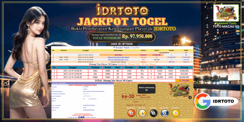 IDRTOTO BAYAR LUNAS JACKPOT PERMAINAN TOGEL TOTOMACAU 5D Rp.97.950.000 – LUNAS