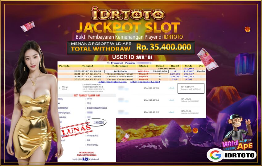 IDRTOTO BAYAR LUNAS JACKPOT SLOT WILD APE Rp.35.400.,000 – LUNAS